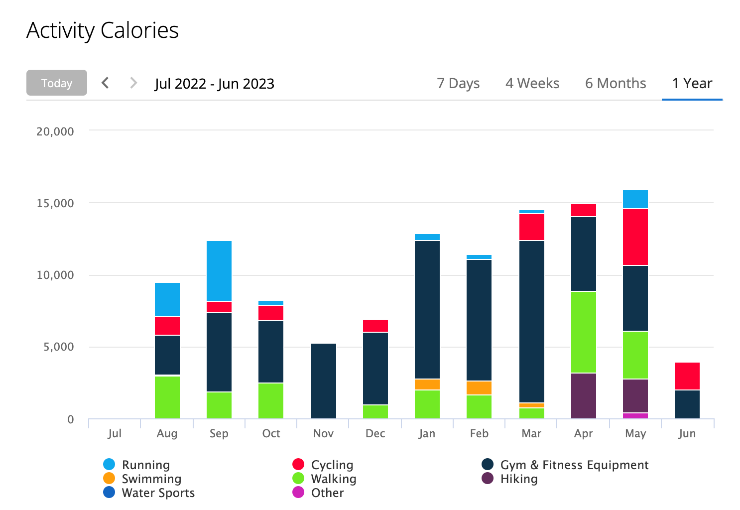 Ako vidíš, väčšinu kalórií som spálil v posilňovni (ale myslím si, že aj joga je tam zahrnutá). Rovnako môžeš vidieť rastúci trend spálených kalórií = zvýšená aktivita a námaha.